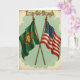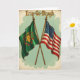 Designed with two crossed flags at the center, this St. Patrick’s Day card pairs Irish pride with an American touch in a softly aged poster style 💚. The left banner is deep emerald green, edged with a thin gold trim, and it carries a golden shield wrapped in leafy green branches dotted with small red berries. Beside it, the American flag fans outward with red stripes, white bands, and a navy corner filled with neat white stars, both fabrics shown with gentle folds as if a light breeze is passing through. Their gold poles meet in an X-shape, topped with small shining finials, creating a close, companionable arrangement that feels like two friends leaning in together ☘️. Above the flags, the words “Erin-Go-Bragh” sit near the top in distressed gold lettering, centered and easy to spot against the background. Behind everything, a muted seafoam-green field with faint cloudy wisps keeps the focus on the flags and lettering. A worn, parchment-toned border frames the scene with slightly rough edges and subtle speckling, like an old print pulled from a keepsake box. Share St. Patrick’s Day sentiments with someone special, and let the seafoam background fade into a weathered tan frame around the crossed flags.