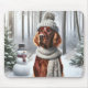 A dog wearing a gray knitted hat and scarf stands in a snowy forest next to a snowman