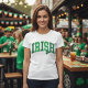 This fun St. Patrick's Day t-shirt features the word 'IRISH' in a curved distressed retro font in light and dark green colors with a coordinating shamrock.