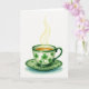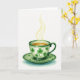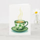 This card shows a single teacup and saucer centered on a wide white background, giving the scene lots of open space and a calm, airy feel. The creamy cup is covered in shamrocks of different sizes, and the rim and curved handle are finished in glossy emerald green for a crisp contrast. Inside, a golden-amber drink glows softly, while thin curls of steam rise up like a quiet invitation to linger with someone close 💚. The saucer beneath is fully shaded in layered greens, with concentric rings and small clover details that feel carefully arranged, like a shared table setting meant for two. Near the top of the design, a short St. Patrick’s Day greeting sits in small green lettering, leaving the cup as the clear focal point. Gentle lighting and smooth shading add depth without clutter, keeping the mood tender and unhurried ☘️. Share St. Patrick’s Day sentiments with someone special.