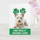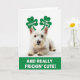 This card features a fluffy white West Highland White Terrier posed proudly against a wide, pure white background, with dark eyes that meet yours like a close friend asking for attention 💚. Above its ears sit two oversized green shamrocks, tilted like silly little headpieces that make the pup look like it’s leaning in for a kiss ☘️. Each shamrock carries small uppercase text—one reads “KISS ME” and the other reads “I’M IRISH”—set in a dark, easy-to-read color. The bright green accessories stand out sharply against the dog’s snowy fur, making the face and headwear the clear focus. The pup’s calm mouth and steady gaze give it a sweet, slightly mischievous look, like it knows it’s getting away with being adorable. Along the bottom, a wide green band stretches across the card and anchors the layout. Centered on that band is large white text that says “AND REALLY FRICKIN’ CUTE!” in thick, attention-grabbing letters. The lighting keeps the fur soft and detailed while the shamrocks stay crisp and saturated against the plain white space.