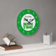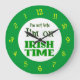 This funny wall clock reads I'm not late, I'm on Irish Time, with Celtic knotwork letters in yellow, backwards numbers on a green background.
