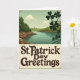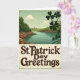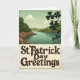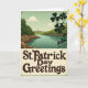 This greeting card shows a vintage travel-poster style view of Ireland, where a teal river winds gently between rolling green hills under soft, diffused light. Along the riverbanks, rugged rocky edges add texture, like a quiet spot two friends might linger and talk a little longer. In the far distance, a small stone-colored castle sits against the horizon, giving the scene a romantic, old-world pull. In the upper right foreground, a cluster of dark shamrocks overlaps like a tender little frame, hinting at closeness and shared tradition ☘️. The color palette stays muted with mossy greens, calm aquamarines, and warm earthy browns, creating an early-spring look with plenty of 💚. Across the lower portion, the text “St. Patrick Day Greetings” curves in deep brown lettering on a creamy band, standing out without overpowering the landscape. A subtle grain runs across the whole image, and the silhouetted shamrocks remain the sharpest detail in the upper right corner.