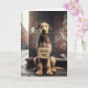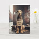 On a city street, an Irish Wolfhound dog sits against a brick wall, holding a humorous cardboard birthday sign for a 40th birthday.