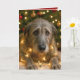 A forlorn Irish Wolfhound wrestles with a jumble of twinkling holiday lights on a soft white fur rug, embodying the mix of holiday joy and chaos.