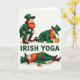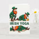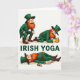 This card shows a three-panel cartoon on a white background that follows a friendly leprechaun through a funny “Irish Yoga” sequence, with a cheeky little nod to St. Patrick’s Day ☘️. In the top panel, he sits upright on a small stool in an emerald suit and tall boots, his orange beard neatly shaped and his wide eyes giving someone off to the side an eager, almost flirty look 💚. In the middle panel, he drops to a crawling pose, focused on a frothy tankard of beer, his grin turning into a determined smirk as if he’s trying to impress a watching friend. The title text “IRISH YOGA” runs across the center area between panels in dark lettering, acting like a divider and a joke at the same time. In the bottom panel, he’s stretched flat on his back with his hat tipped sideways, his face relaxed and eyes rolled up in tired satisfaction. Two empty bottles sit near him, colored in warm browns with small highlights that stand out against the white space. The greens of his outfit and hat contrast with the bright orange beard, and the beer foam is drawn in pale cream with rounded edges. End with a friendly line about sharing St. Patrick's Day sentiments.