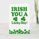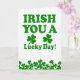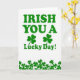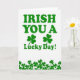 This card features a bright emerald-green design on a plain white background, with the main message centered and sized to catch the eye right away. The text reads “IRISH YOU A Lucky Day!” in a friendly sans‑serif style, and two small three‑leaf shamrocks replace a couple of letters to create a clever little twist ☘️. Those clovers feel like tiny nods to friendship, like a shared inside joke between two people who know how to make each other smile. The lettering stays in green throughout, with “Lucky Day!” standing out through spacing and emphasis rather than extra decoration. The overall look is flat and simple, with no shadows or texture, so the green shapes and letterforms stay sharp and easy to read. Near the bottom, a wide, wavy band of many small shamrocks stretches across the lower edge like a gentle garden border 💚. The lowest section is filled with repeating clovers in the same green, forming an undulating line against the white space.