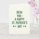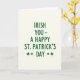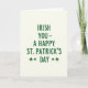 This card features a refined St. Patrick’s Day layout on a creamy off-white background, where the greeting becomes the main scene in emerald green 💚. The words “IRISH YOU” sit at the top in a classic serif style, stacked above “A HAPPY” and then “ST. PATRICK’S DAY,” creating a neat vertical flow down the center. The deep green color feels like a quiet nod to Irish hills and shared toasts, like two friends leaning in close to read the lines together. The spacing between the lines gives each phrase room to breathe, keeping the look calm and focused rather than busy. Beneath the final word “DAY,” two matching three-leaf shamrocks appear side by side, echoing the same green and adding a gentle lucky touch ☘️. Everything is centered, with the text and symbols aligned to feel balanced and steady against the soft background. The two shamrocks sit symmetrically under “DAY,” small and crisp, like twin accents anchoring the bottom of the design.
