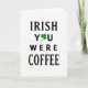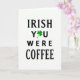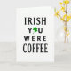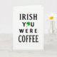 This greeting card features the phrase “IRISH YOU WERE COFFEE” set in black serif letters, stacked and centered on a bright white background. The layout feels like a quick, flirty note you’d slide across the table to a friend or someone you’re sweet on, with the words landing like a gentle tease. “IRISH” sits at the top, “YOU” is placed beneath it, and “WERE COFFEE” finishes the line at the bottom in the same dark type. In “YOU,” the “O” is replaced by a small emerald shamrock that reads like a wink—part lucky charm, part coffee-date invitation ☘️. That single green detail draws your eye first, then guides you back through the rest of the message as if the card is sharing an inside joke. The strong contrast between the black letters and white space keeps everything crisp and easy to read, letting the humor do the talking 💚. The shamrock is a tidy three-leaf shape in rich green, sitting exactly where the “O” would be in the middle word.