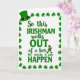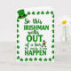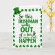This card features a classic St. Patrick’s Day joke in rich green lettering on a white background, with the line “So this IRISHMAN walks OUT of a bar No really it can HAPPEN.” The words “IRISHMAN,” “OUT,” and “HAPPEN” are set larger and heavier, while the rest of the sentence uses a smoother, flowing style, creating a fun back-and-forth rhythm across the center. A neat border of small three-leaf shamrocks frames the edges, adding a festive touch ☘️. In the upper left corner, a deep green leprechaun hat with a gold buckle sits like a friendly wink to the theme 💚. Near the phrase “of a bar,” a tiny leprechaun with an orange beard and green outfit walks forward, as if proudly acting out the punchline for anyone reading along. The layout feels like a shared inside joke between friends, with the little character’s confident stride making the humor feel more personal. The shamrock border repeats evenly all around, and the hat and walking leprechaun stand out in green and gold accents against the bright white space.