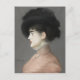 Irma Brunner by Edouard Manet, pastel painting c. 1880, is a profile portrait of an elegantly dressed young French woman in salmon pink blouse with high collar and ruffles with a large, black feathered hat over her tied back, dark brown hair. Manet boldly contrasts smoothly modeled pastel tones with deft strokes of the pastel chalks defining the sitter’s features and details, in a brilliant tonal range from the porcelain whites of the woman’s complexion to the deep, velvet blacks of her hat and hair. The artist creates a striking image of a stylish young woman of 19th century Paris, painted spontaneously as if capturing a fleeting moment in time.