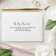 Designed to coordinate with our modern Isabella wedding invitation collection, this envelope features a liner with your photo already pre-printed on the inside, saving you time and money (no need to pay for and paste in separate envelope liners!). The recipient's address and your return address are written on the front and back flap in whimsical, black calligraphy script set against a clean, white background. Order each envelope individually so you can customize the recipient's information. Be sure to check out the other products in this collection to create a coordinated, chic look for your wedding. Please contact me at admin@albamarie.com if you need assistance customizing this product or if you would like me to create a matching product. I'd be happy to help!