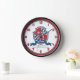Knights style shield crest monogram letter I art name simple numbered wall clock in shades of red, blue white and grey. Personalize with your own name and name meaning for a personalized touch to your child's bedroom or nursery, this example is for names starting with the letter I. Currently reads Isaiah God is my salvation. Athletic, knowledgeable and brave. Unique graphic shield design with a wolf dog animal, crown and star. Original art, name research, wording and design by www.mylittleeden.com