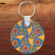 A stylish Key Chain with a traditional Islamic pattern, from a screenprint by Judy Adamson. The stars and geometric shapes are in green, deep red and golden yellow outlined in orange on a bright blue background.