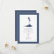 A simple, modern beach wedding save the date featuring a dark blue illustration of an island with two palm trees. Border, custom text, and opposite side are also blue.