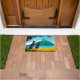 Greyhound, Whippet and/or Italian Greyhound silhouettes on sand with foliage, water and island.