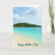 This greeting card shows a calm tropical beach scene under a clear blue sky with a few puffy white clouds drifting overhead. The ocean shifts from deep blue near the horizon to a light aquamarine close to shore, giving the water a gentle, inviting look. Across the middle sits a lush green island, its leafy slopes forming a quiet backdrop that feels like a private getaway shared with someone you love ❤️. Near the island’s base, a few sunlit rocks peek out, adding texture and a sense of closeness, like a soft moment paused in time. In the foreground, pale creamy sand meets a thin line of white foam as the waves curl in and slide back, leaving a glossy sheen. The message “Happy Mother’s Day!” is placed over the scene in flowing white lettering, standing out clearly against the blues and greens 🌼. The words sit near the lower portion of the design, just above the shoreline where the water meets the sand. The foam edge traces a gentle curve along the beach while the island stretches horizontally across the mid-ground.