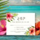 Tropical wedding RSVP enclosure card features watercolor green palm tree leaves and pink and coral hibiscus flowers. This can be personalized with your response date and meal selection options and is perfect for a beach theme or island destination wedding.