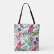 In vibrant island style, this tropical themed tote has a colorful pattern of exotic orchids, lilies and parrot flowers with scattered palm fronds and foliage over a contrasting white background. An aqua round frame placed at the top of the bag includes a text template for personalizing with your desired name and monogram initial. This colorful tote is great for running errands, taking along on vacations, cruises and other travel, for school or work, or in your day to day routine. It makes a lovely custom gift.
