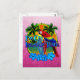 Island time is a reference to how life is on islands, people are more apt to slow down and enjoy life. Rather than the normal rat race we live in on the main land. Beautiful beach sunset behind surfboards and palm trees, framed with bamboo and hibiscus flowers. And a colorful macaw parrot.