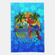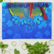 I'm On Island Time artwork and designs. Island time is a reference to how life is on islands, people are more apt to slow down and enjoy life. Rather than the normal rat race we live in on the main land. Beautiful beach sunset behind surfboards and palm trees, framed with bamboo and hibiscus flowers. And a colorful macaw parrot. Background of bright blue hibiscus flowers and Honu Sea Turtles design.