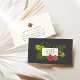 Tropical chic business cards feature your name and/or business name nestled in a frame of green banana and monstera leaves with red and coral hibiscus flowers illustrated in a vintage hand drawn style, on a charcoal gray background. Personalize with your contact information on the reverse side in grey on ivory with a matching coral hibiscus.