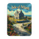 A nostalgic and picturesque depiction of the Isle of Man, situated in the Irish Sea between Great Britain and Ireland. The design highlights the island's rugged coastline, rolling green hills, and historic landmarks such as Peel Castle and the Laxey Wheel. Rendered in a vintage style, the artwork captures the timeless allure and natural beauty of the Isle of Man, inviting viewers to explore its rich heritage and scenic landscapes.