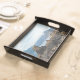 This is a well made, sturdy wooden tray with a flawless black finish and lovely map on the tray surface. It is both vintage & modern at the same time. Looks exactly like the photo; does not disappoint. So nice to find something of quality individually made and not the mass-produced 'shabby chic' merchandise seen in stores. I am so pleased to be able to give this to my college-age niece for her birthday. This can be used as a tray to hold jewelry or toiletries, or hung on the wall as art. The map surface is sealed (it is slightly shiny) so would be moisture resistant. It is well worth the asking price but I was able to apply a sale code as well. Very happy with my purchase. Map is crisp & clear and sealed with a water-resitant finish.