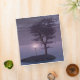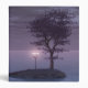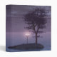 A 3D fantasy scene created in Vue: on a lonely island in the midst of the peaceful sea stands a lamppost with four pale pink glowing lamps. A lone tree with purple-grey leaves, an abandoned little boat, and a passing dolphin are the only other signs of life in this eerie ocean.
