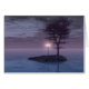 A 3D fantasy scene created in Vue: on a lonely island in the midst of the peaceful sea stands a lamppost with four pale pink glowing lamps. A lone tree with purple-grey leaves, an abandoned little boat, and a passing dolphin are the only other signs of life in this eerie ocean.