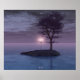 A 3D fantasy scene created in Vue: on a lonely island in the midst of the peaceful sea stands a lamppost with four pale pink glowing lamps. A lone tree with purple-grey leaves, an abandoned little boat, and a passing dolphin are the only other signs of life in this eerie ocean.