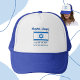 Trucker hat shows the blue and white Israeli flag with the Star of David and the word ISRAEL below in the colors of the flag. Above, a spot for a name. You can add your name for a personalized touch to this trucker hat, or, someone else's name for a customized gift. Fun for family reunions, travel groups, and clubs.