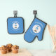 An angel wears the flag of Israel on these oven mitts for holiday decorating or Hanukkah decor. The Israeli angel is found inside a white, fractal circle of squiggly squares. The background is blue squiggly squares. White text for name, year, and holiday. Fun housewarming gift or Hanukkah present.