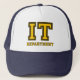 IT Department cap. If you're in the Information Technology Department, you can show it off with this IT Dept. trucker's hat. Design is a font that looks like college and sports. A thick serif font, don't ya know. Letters are golden yellow with a thick brown border. A fun geek hat.