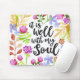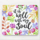 Modern hand-lettered style typography design with words, "It is Well with my soul" words from the well-known hymn. Type is surrounded by colorful watercolor flower border on all sides.