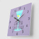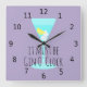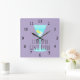 It must be gin o' clock - a wall clock with numbers and decorated with a glass of gin and tonic with a slice of lemon, on a dusky lilac background. The clock has simple, black numbers.