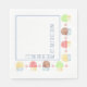 This fun napkin design has a several scoops of ice cream alternating with pink daisies. The center of the napkin has a blue bod and text that reads, 'IT'S TIME FOR ICE CREAM'.