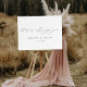 This minimalist wedding welcome sign features a clean white background with elegant black script and serif fonts. The phrase "And So Begins Our Story" is prominently displayed, followed by the couple's names, and the wedding date. The design exudes modern simplicity and romance.