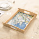 This is a well made, sturdy wooden tray with a flawless black finish and lovely map on the tray surface. It is both vintage & modern at the same time. Looks exactly like the photo; does not disappoint. So nice to find something of quality individually made and not the mass-produced 'shabby chic' merchandise seen in stores. I am so pleased to be able to give this to my college-age niece for her birthday. This can be used as a tray to hold jewelry or toiletries, or hung on the wall as art. The map surface is sealed (it is slightly shiny) so would be moisture resistant. It is well worth the asking price but I was able to apply a sale code as well. Very happy with my purchase. Map is crisp & clear and sealed with a water-resitant finish.