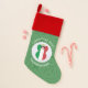 Christmas stocking for your holiday and Christmas decor showing an angel wearing the green, white, and red flag of Italy. The Christmas Italian flag angel flies inside a circle of white squiggly squares. The background is green squiggly squares. Add your own text or personalize with a name and customize with the year.