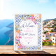 This bridal shower welcome sign combines Italian-Mediterranean blue ceramic tile patterns with cheerful hand-painted pink wildflowers for a fresh, modern look. The elegant brush script and unique arch shape create a sophisticated yet vibrant design. Perfect for adding a touch of tradition and contemporary flair to your event.