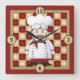 This old world clock has a chubby Italian chef wearing a red scarf, white chef's hat, red pants against a pizza colored checkered background and he's ready to cook and ready to decorate your kitchen.