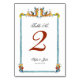 Elegant Italian Wedding Table Number card featuring hand painted watercolor vintage Italian pottery pattern in Terra-cotta, gold and blues.