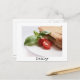 Postcard with healthy Italian food consisting of a panini sandwich and a tomato, green basil leaves and mozzarella cheese on a white background with the text: 'Italy'.