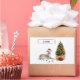 Ears perked and ready for fun, this Italian Greyhound is wearing a Christmas hat and red bow tie. A few muddy prints are left as you wish a paws-itively good holiday to people on your Christmas list. A holiday tree is pretty next to the dog.
