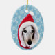 Italian Greyhound in santa hood with light blue and white snowflake background.