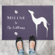 Elegant dog lovers doormat with white Greyhound silhouette minimalist design on custom color. Stylish and cool housewarming gift for Italian greyhound, Whippet or other sighthound dog owners. • Personalize it with name, remove text or customize further - edit background color and fonts, move/resize images, add text and more! • • • I'd be happy to see a photo of your purchase - message me or just share it and tag me @edrawings38art (on FB/IG/Twitter)! Thank you! 💜