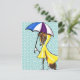 Hand drawn illustration of an Italian Greyhound in yellow rain slicker holding a brightly colored umbrella against a blue background of tiny white little umbrellas.