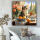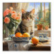 Fine art painting featuring a pretty tabby cat in a still life scene in Italy with roses and oranges. This painting is part of a series.