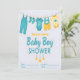 The cheerful teal and sunny yellow color scheme creates a perfect gender reveal / baby shower vibe. Below the hanging clothes, elegant script reads "Join us to celebrate Baby Boy SHOWER" with hanging yellow stars for extra cuteness